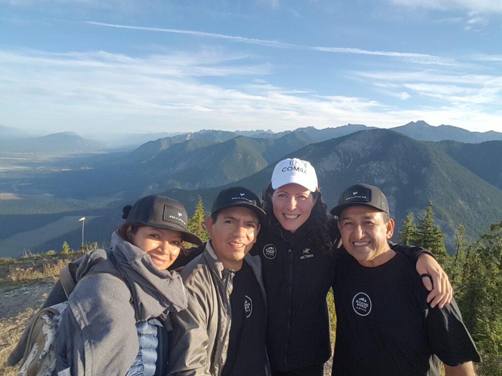La direction générale de trois coopératives Fairtrade a visité l’équipe de Kicking Horse Coffee à Invermere, en Colombie-Britannique. De gauche à droite : Griselda de UCASJRC au Nicaragua, Javier de Sol y Café au Pérou, Maddie de Kicking Horse Coffee et Rodolfo de COMSA au Honduras. Cette visite s’est avérée une superbe occasion pour Griselda, Javier et Rodolfo d’échanger sur les défis de la direction générale et de mettre en commun leurs apprentissages. Tout le monde en a profité pour déguster du café et en évaluer la qualité.