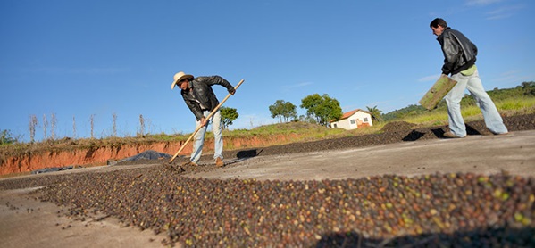 Pour traiter les cerises de café, la « méthode mouillée » nécessite elle aussi un important volume d’eau. Un volume si élevé que plusieurs productrices et producteurs Fairtrade préfèrent avoir recours à la « méthode sèche » qui consiste à laisser les cerises sécher naturellement au soleil, sur des terrasses ou des étagères. Bien que cette méthode requiert davantage de travail manuel, elle utilise beaucoup moins d’eau. Sur cette photo, nous y voyons Wilson Pedroso Lima et José Milton Bento, de la coopérative productrice de café COOPASV au Brésil, racler le café qui sèche au soleil. Photo de Didier Gentilhomme.