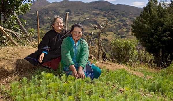 Les 840 000 et plus productrices et producteurs de café Fairtrade sont de petits exploitants agricoles. La taille moyenne des lotissements de terre étant à peine plus grande qu’un terrain de football. Fairtrade a offert à plusieurs agricultrices et agriculteurs des formations sur l’importance de la biodiversité et sur la qualité des sols. Bon nombre d’organisations de productrices et de producteurs ont utilisé la prime équitable Fairtrade pour développer des pépinières. Ces pépinières ont souvent un double usage soit celui d’assurer un approvisionnement constant en nouveaux plants de café pour assurer la vitalité des installations agricoles puis servir à la reforestation des zones qui ont été dépouillées de leurs arbres. Sur la photo qui suit se trouvent Teodola García García et Erlinda García Jiménez qui voient à l’entretien des jeunes pins dans une pépinière située dans le village de Cajas près de Choco, dans le nord du Pérou. Depuis plusieurs années, la coopérative Norandino travaille à reboiser les coteaux dénudés. Photo de Danielle Villasana.