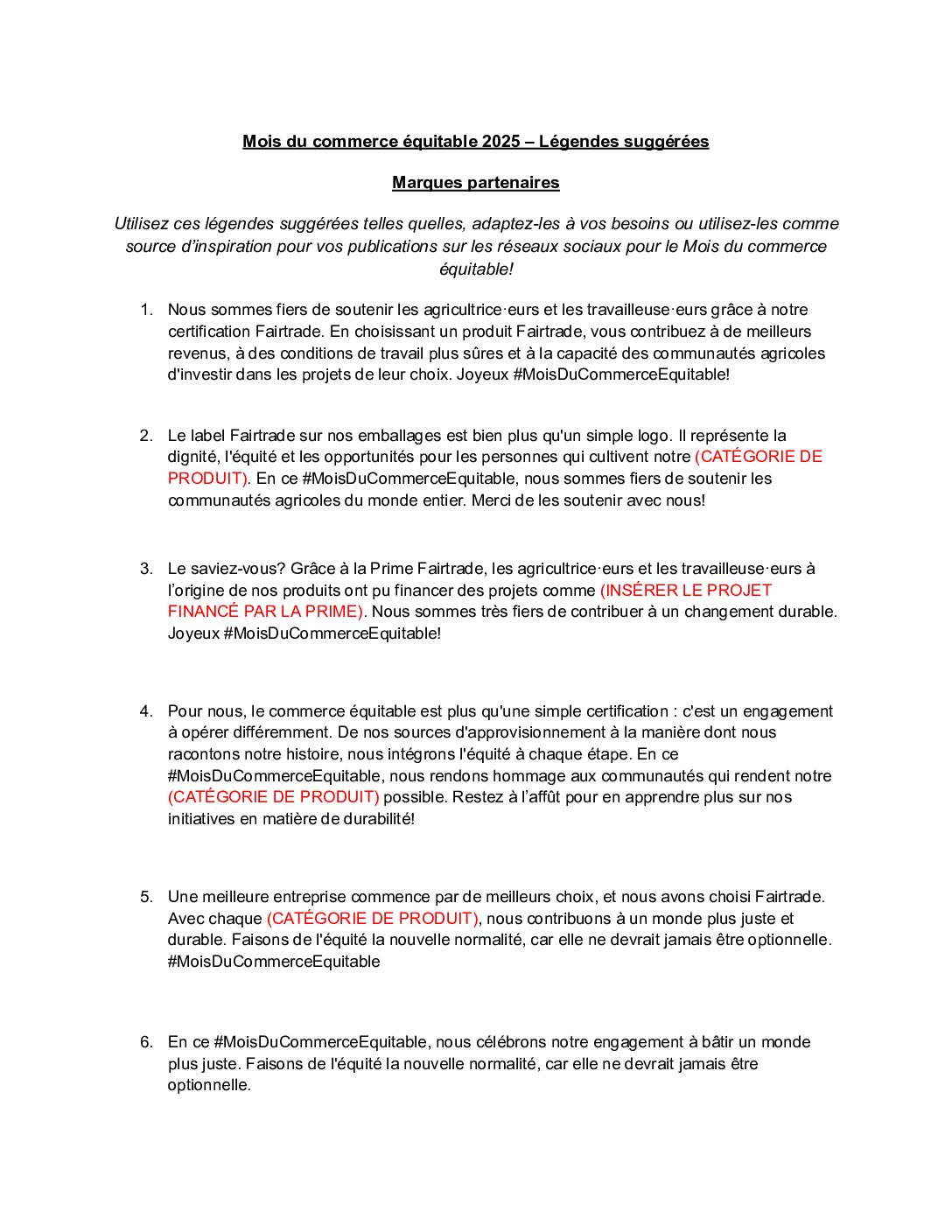 TROUSSE D’OUTILS POUR MARQUES PARTENAIRES Partager Guide de campagne pour les marques partenaires TÉLÉCHARGER Galeries de photos CHOISISSEZ VOS PRÉFÉRÉES Visuels pour les médias sociaux et légendes suggérées TÉLÉCHARGER Vidéos TÉLÉCHARGER Logos de campagne TÉLÉCHARGER Logos Fairtrade TÉLÉCHARGER Arrière-plans virtuels TÉLÉCHARGER