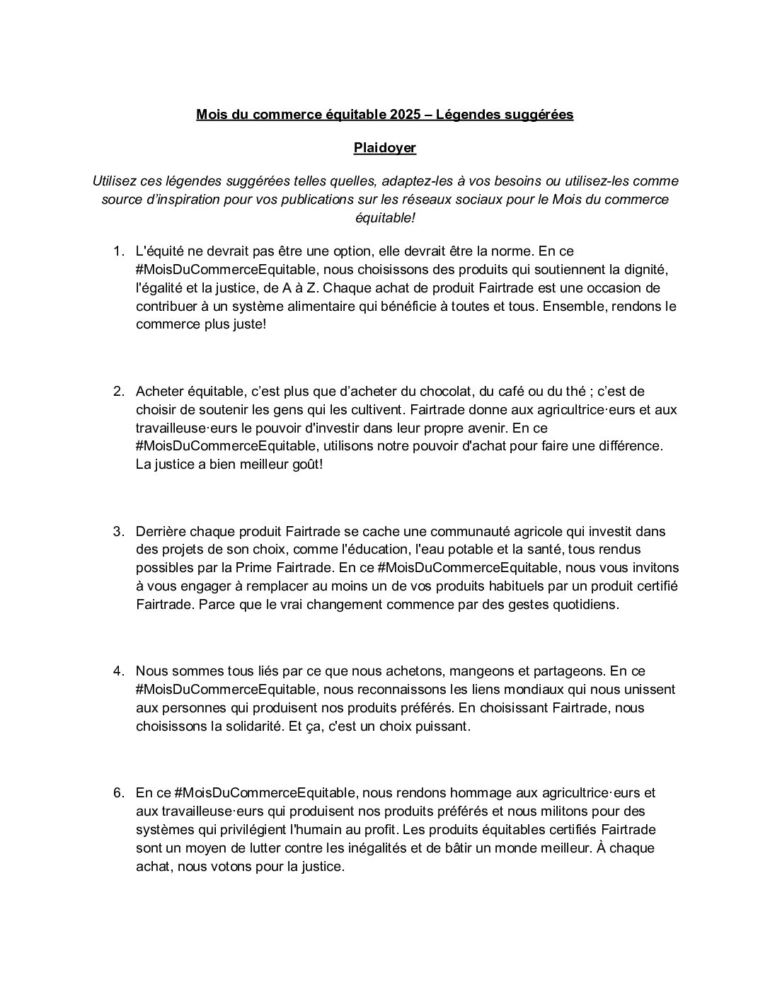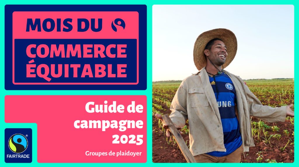 TROUSSE D’OUTILS POUR LE PLAIDOYER Partager Guide de campagne pour le plaidoyer TÉLÉCHARGER Galeries de photos CHOISISSEZ VOS PRÉFÉRÉES Visuels pour les médias sociaux et légendes suggérées TÉLÉCHARGER Affiche imprimable TÉLÉCHARGER Vidéos TÉLÉCHARGER Logos de campagne TÉLÉCHARGER Logos Fairtrade TÉLÉCHARGER Arrière-plans virtuels TÉLÉCHARGER