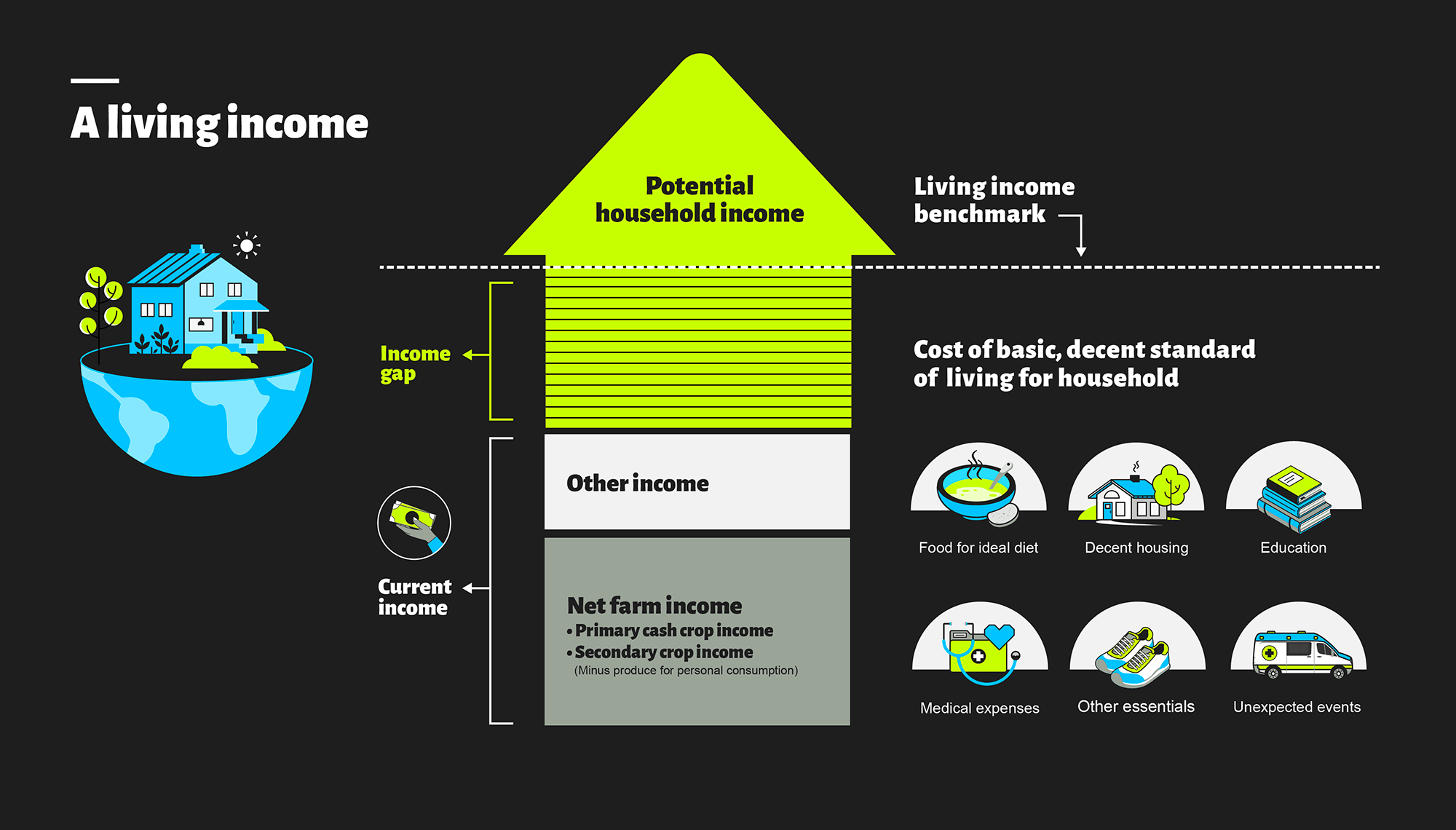 We consider a living income as the amount needed to provide for farm costs, their household needs like food, healthcare, housing, and education, plus some discretionary funds (for opportunities and emergencies).